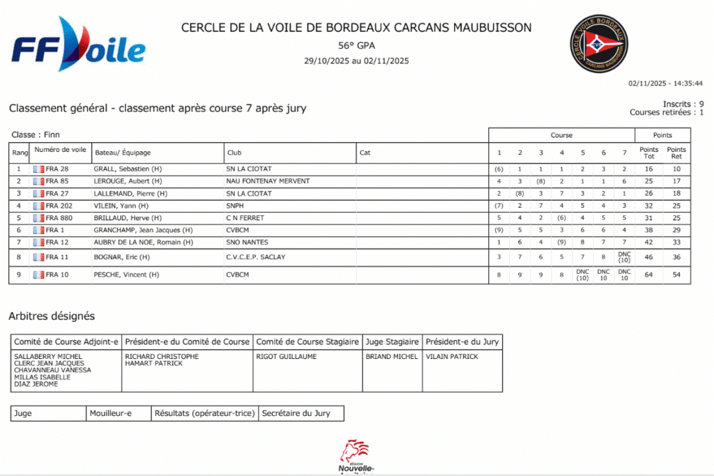 Les résultats: 56ème GPA : Grand Prix Armistice Dériveurs 505-470-Fireball- Finn-Yole- Birdyfish- RSfeva IND (31 Oct – 2 Nov 2025)